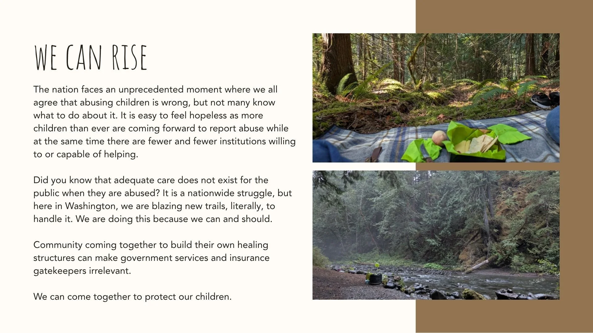 We are a system of survivors ready to share what works with the next generation. We believe those with lived experience should create, preserve, and grow healing systems for future generations because that is trauma informed care.