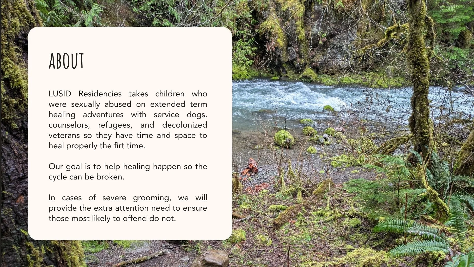 When the fundraising goal is met, land will be purchased for the development of a lodge as a permanent home and expansion of LUSID Residencies on the traditional homelands of the Jamestown S’Klallam People allowing us to help exponentially far more children heal.
