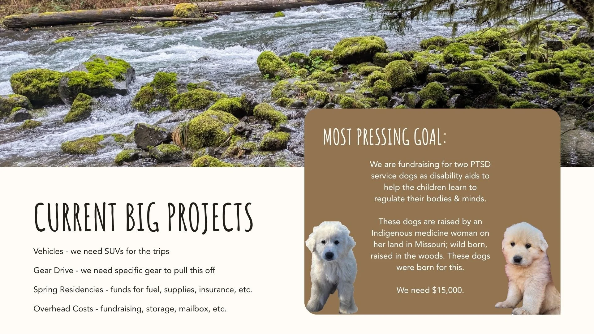 There’s a lot of work to do, and it can be overwhelming to look at it all as one big lump. We get it. So we broke it down into some more manageable chunks. The general fund will be used for awareness, fundraising, overhead, and operating expenses. Land & Lodge, Vehicles, Service Dogs, and the Spring 2026 Adventures are all self explanatory and funds given to those projects will determine when they get completed.